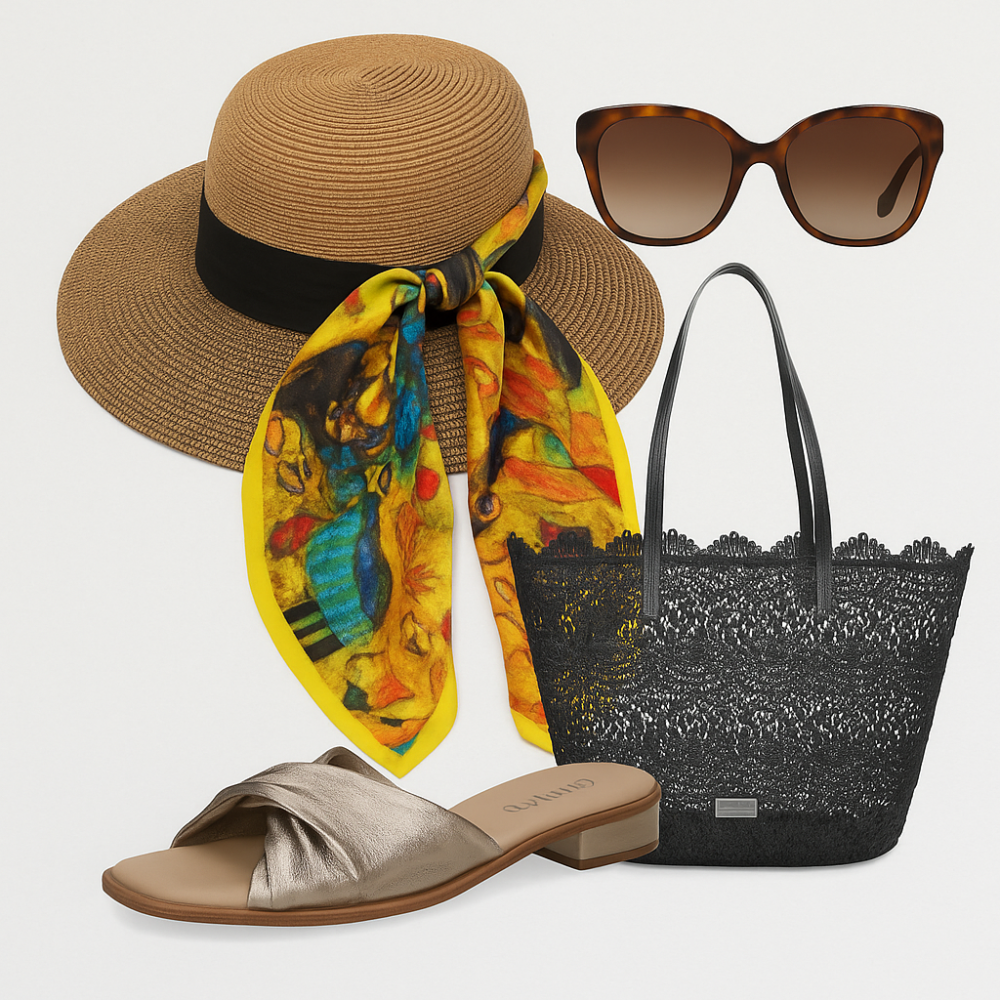 Плетёная шляпа с чёрной лентой и яркий шёлковый платок создают атмосферу ретро-гламура. Туфли в металлическом оттенке придают блеск, а кружевная чёрная сумка добавляет изящества. Завершают образ стильные солнцезащитные очки в тортовой оправе. Идеально для прогулок по побережью, кафе на террасе
